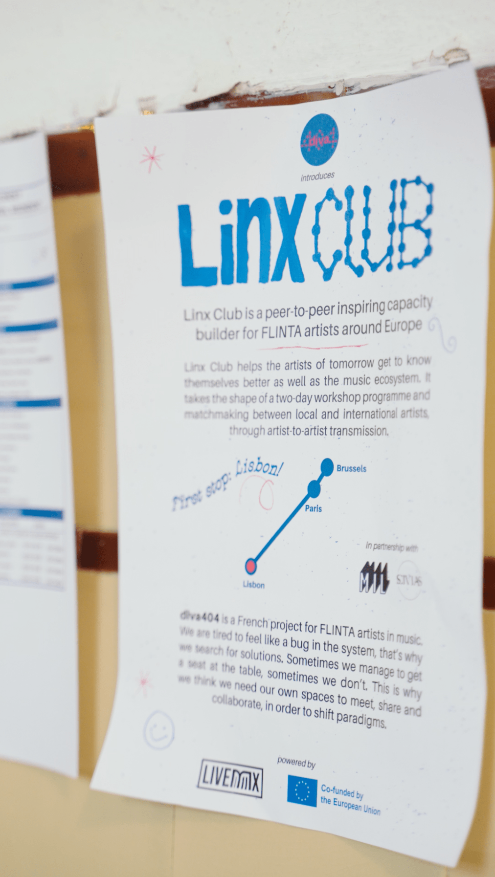 Linx Club is an initiative led by diva404 which aims to help the FLINTA artists of tomorrow get to know themselves better as well as the music ecosystem. It takes the shape of a two-day workshop programme and matchmaking between local and international artists, through artist-to-artist transmission. Deriving from the main visual identity, Linx Club plays with the DIY spirit to highlight the human involvement in the industry and create a sense of sorority between the participants.